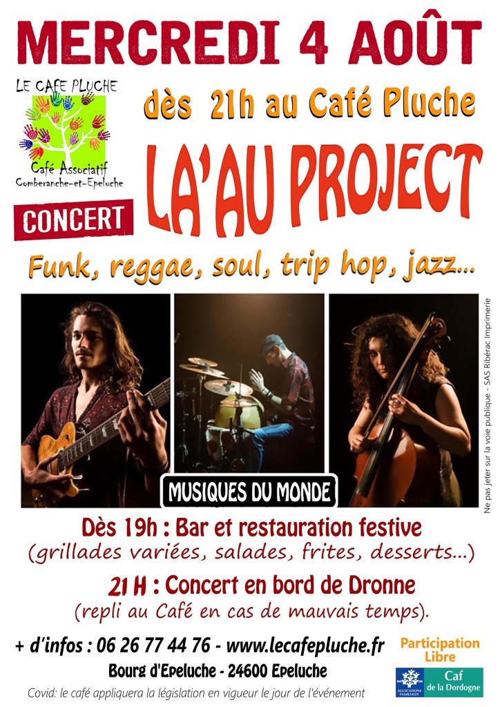 Ce mercredi 04 août c’est le Groupe « LA’AU PROJECT » qui s’installera sur notre pelouse (s’il fait beau, sinon en salle) pour nous distiller le meilleur de leurs créations originales.