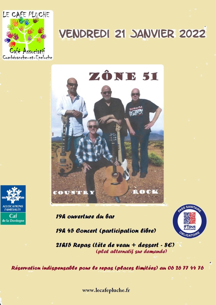 The band « Zone 51 » (folk rock) enjoyed us this summer so they will perform again in Café Pluche on friday, january 21th from 7:45 pm to 9:15pm. T. Nice evening coming…