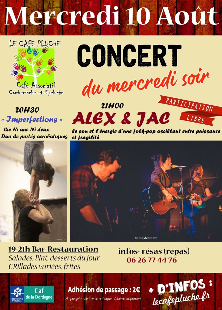 – à 21h00 Le concert avec le groupe Alex & JAC, un trio acoustique (chant guitare percussion), formé depuis 2019 qui nous distille un folk pop francais de leur composition, oscillant entre puissance et fragilité + vidéo