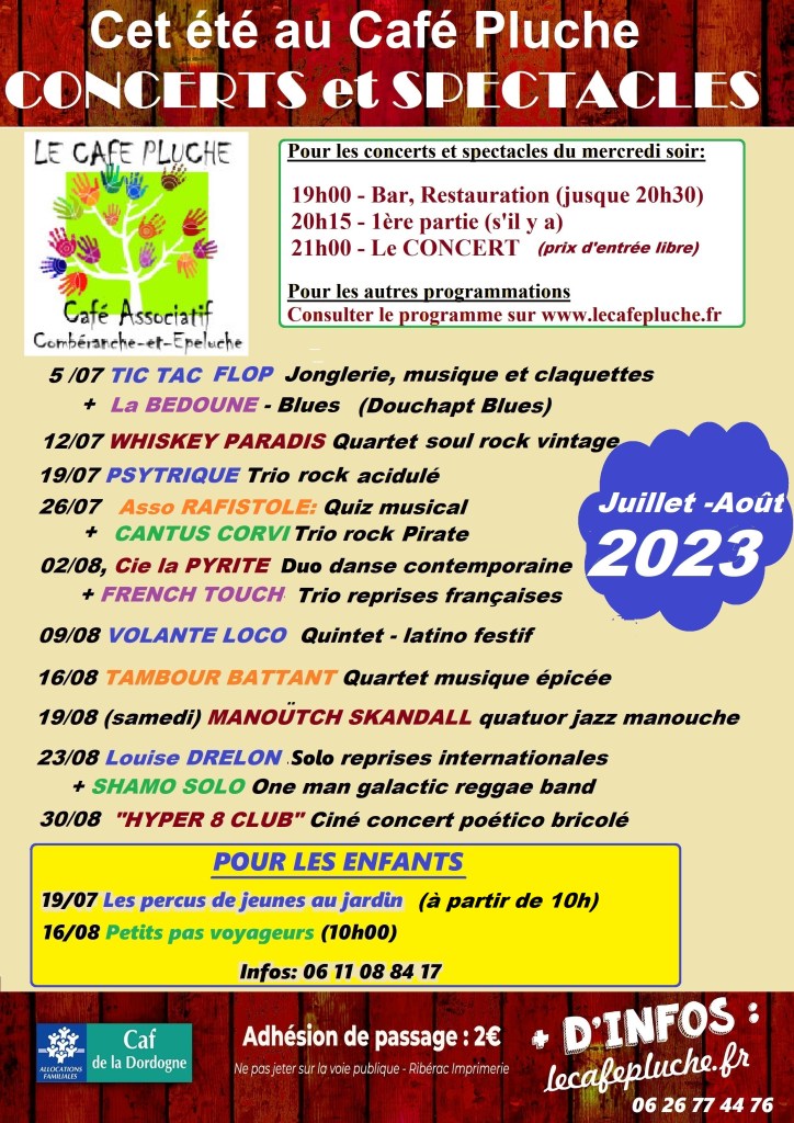 Comme les années précédentes, chaque mercredi de juillet et août, les bénévoles du café Pluche vous proposent d’assister à ces concerts et spectacles à participation libre, pour tous les publics : programme sur l’affiche.