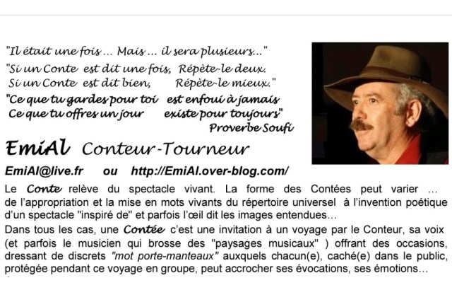 EmiAl est un passeur de mots, un faiseur d’histoires. Les contes qu’il anime pour nous et avec nous sont ceux du Périgord mais peut-être aussi du monde entier, selon son humeur et nos envies du moment!