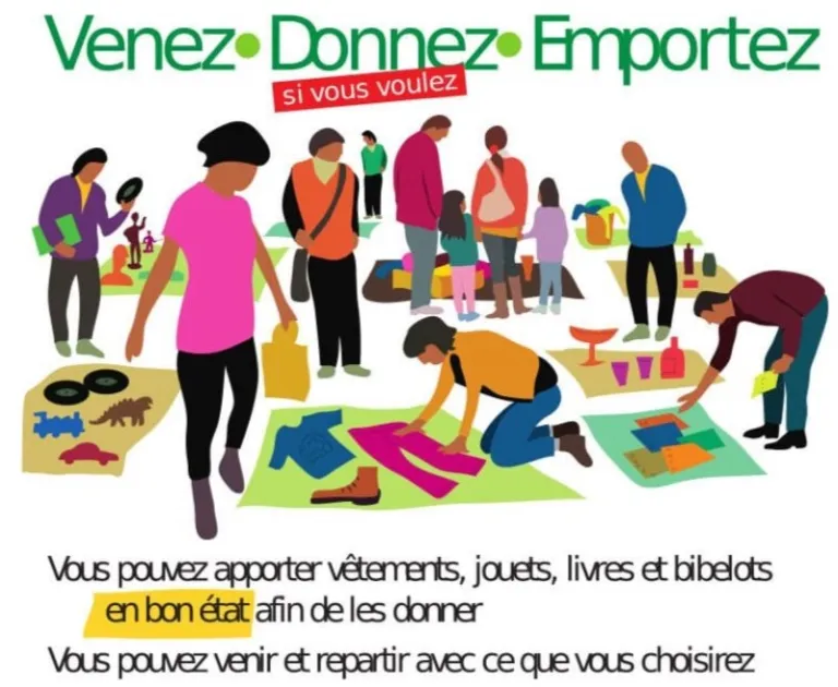 Amenez des objets, vêtements, vaisselle, jouets, livres, plantes etc. que vous voulez donner.